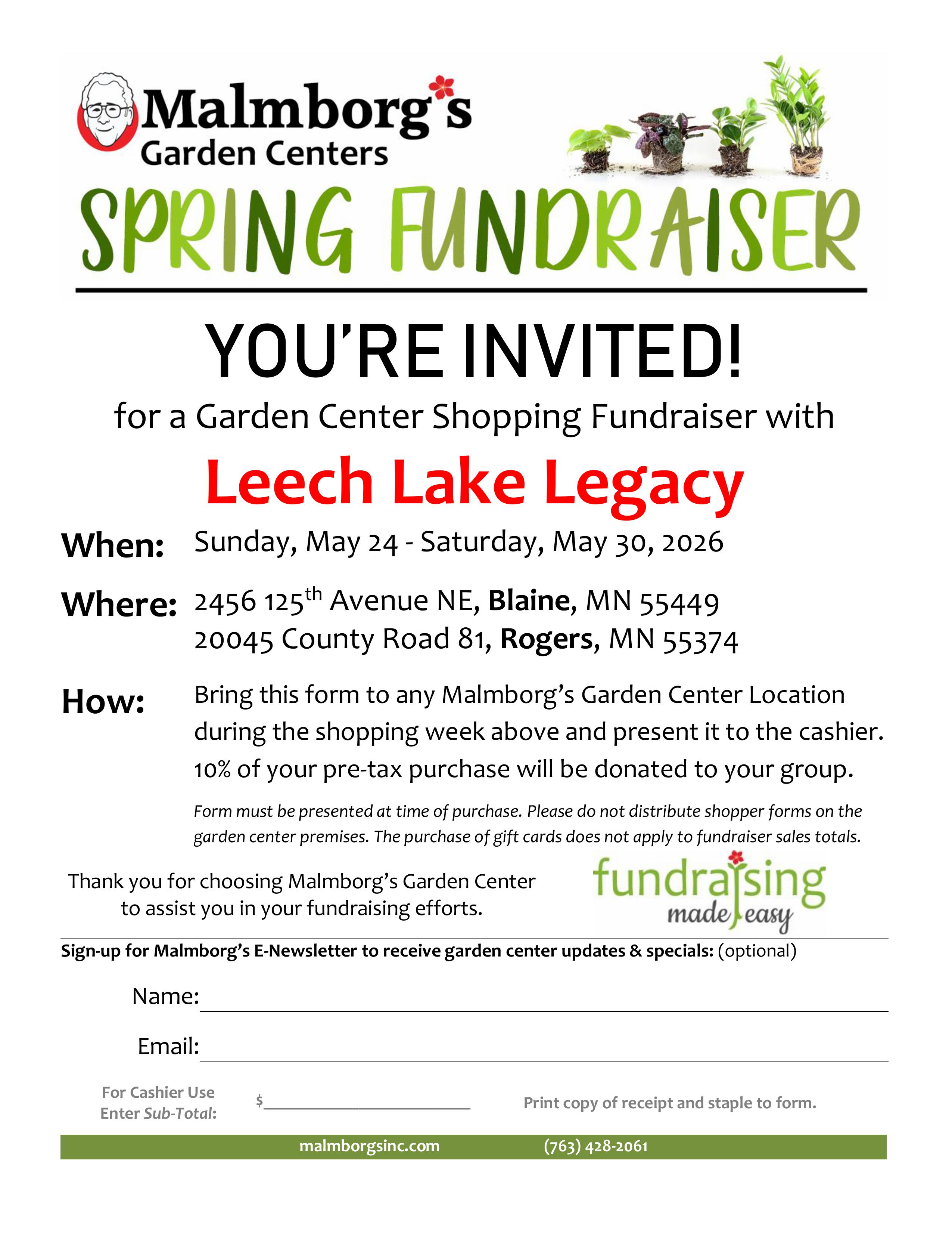 Springtime weather may seem far away, but that doesn't mean you can't plan for springtime gardening! 10% of your pretax purchases at Malmborg's Blaine and Rogers locations from Sunday, May 24 through Saturday, May 30 (mark your calendars!) will be donated to Leech Lake Legacy. You MUST print this flyer (click on the download below for a PDF or JPG flyer) and present it to the cashier at checkout. Happy spring, happy shopping, and happy gardening!